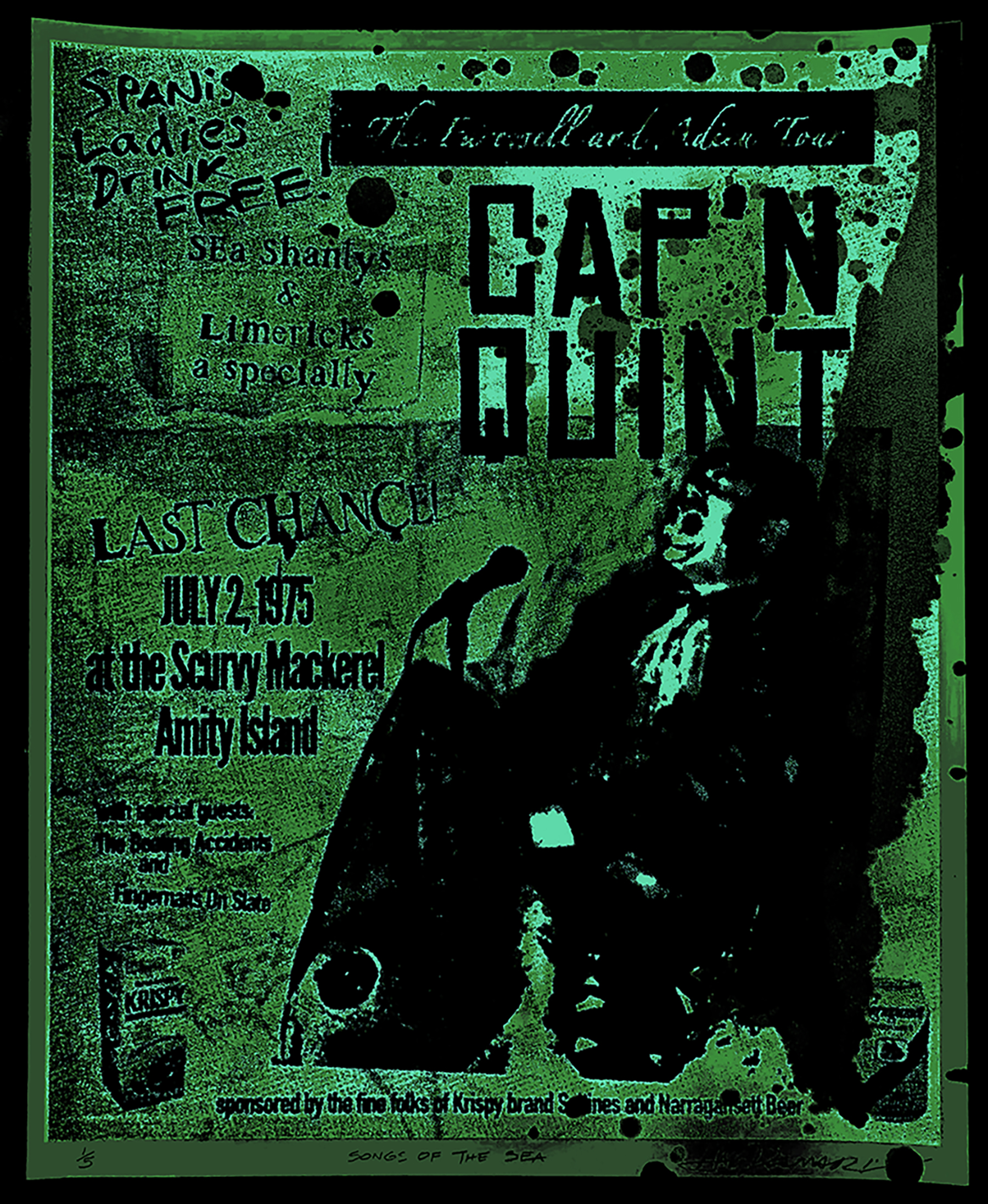 This print is the artist's imagining of Captain Quint as he may have been and as we never knew him. He was certainly a hardened, somewhat unhinged shark-hunter, but he also was a bit of an entertainer. Songs and limericks were his stock-in-trade. Maybe on occasion he sang and spun tales of fish and fist-fights at the local watering holes.
