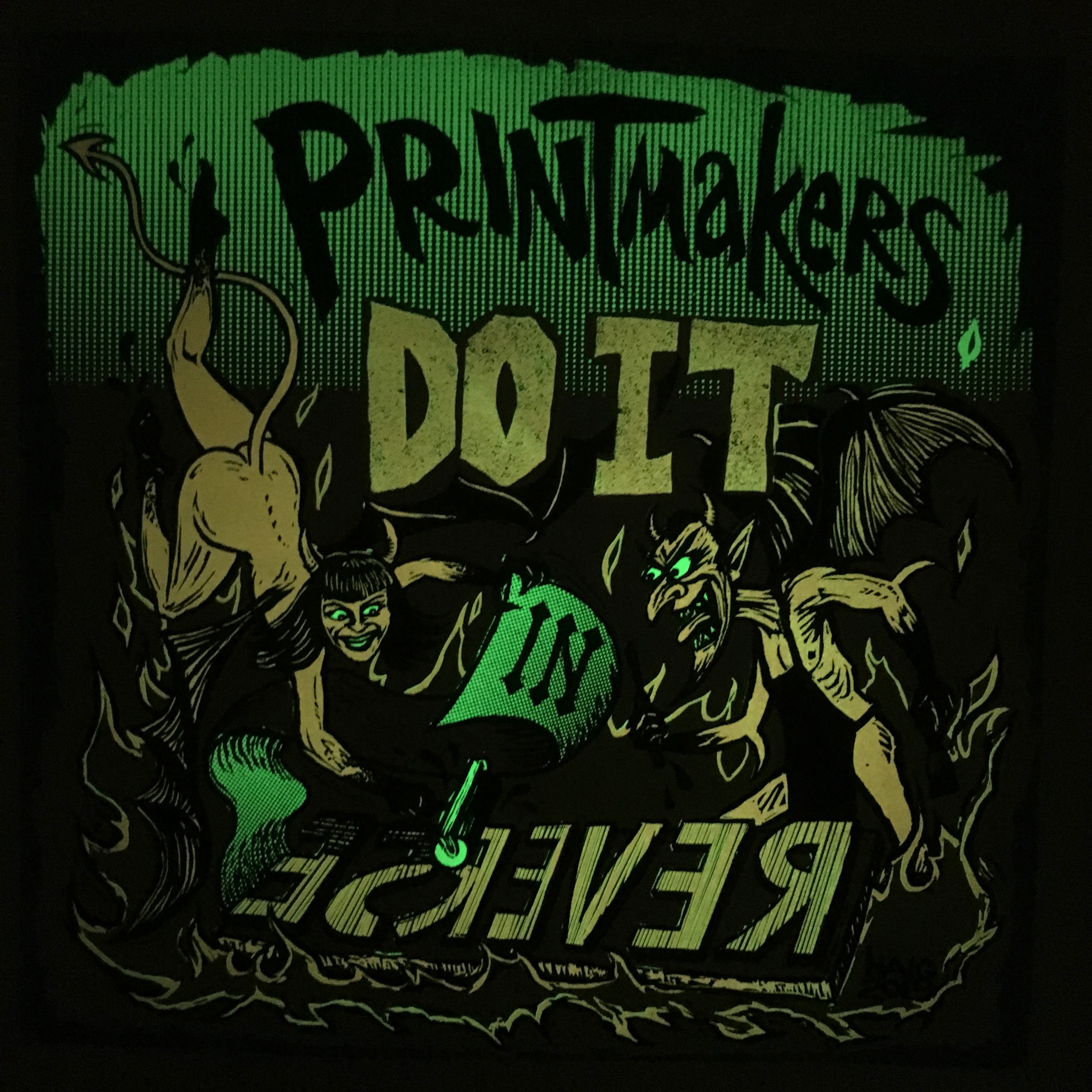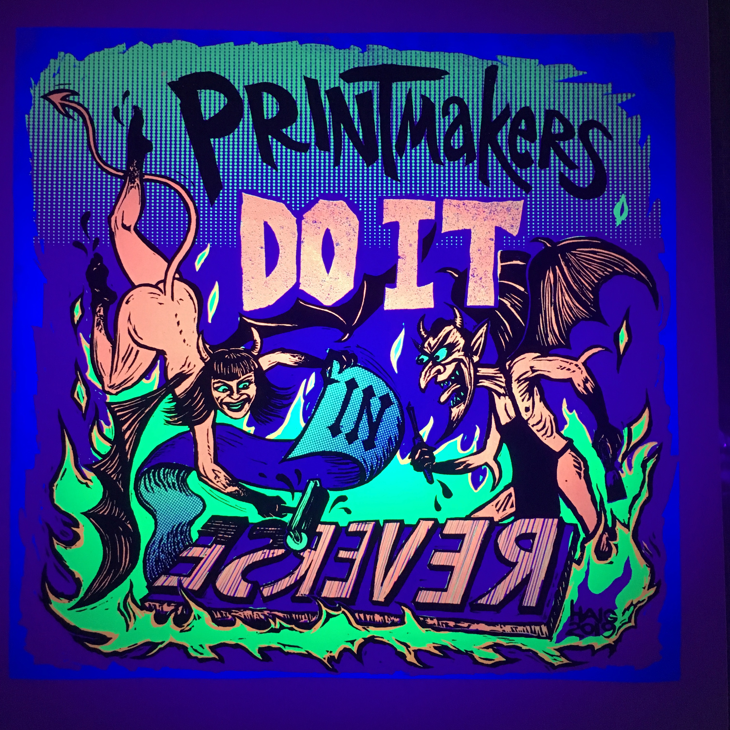 This 5-color blacklight-reactive glow-in-the-dark hand-pulled screenprint wants to hang in your shop and remind us all to not forget to remember to work in reverse! You need this. Right, Printmakers?